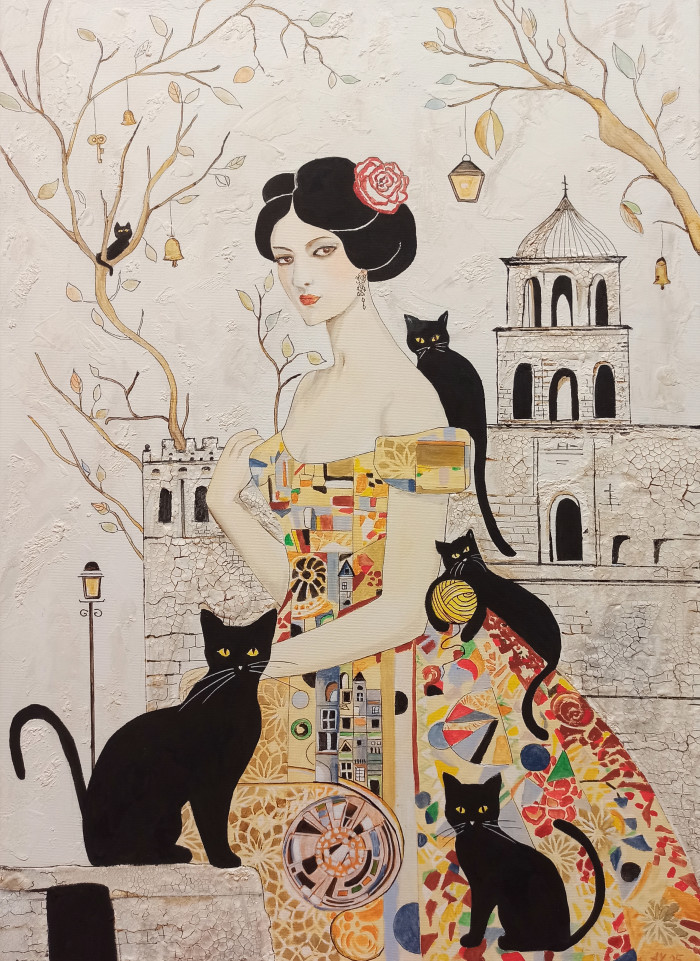 «Берегиня - хранительница старинных городов и черных кошек» — самая мистическая из серии. Она царит над крышами древних городов, храня их тайны, легенды и намоленную атмосферу. А ее верные спутники — черные кошки, существа, наделенные древним, глубоким значением. Она — воплощение духа места, защитница всего, что овеяно временем и тайной.Они такие разные, но их объединяет одно — суть Берегини - женская сила, которая не завоевывает, а оберегает. Которая хранит память, мудрость и тихую магию повседневности.