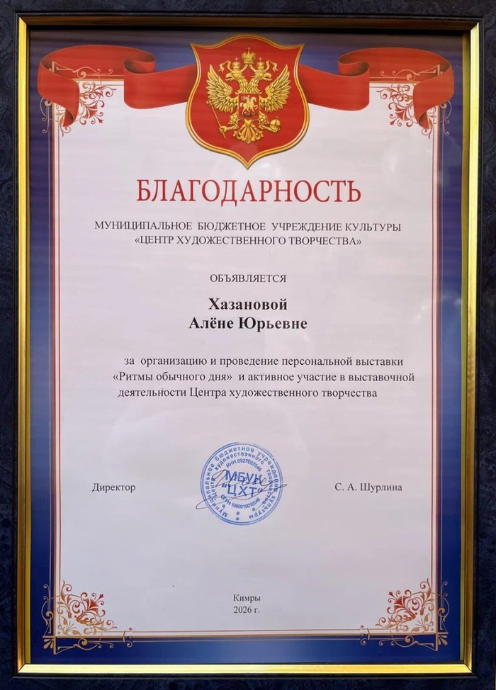 Важным и приятным моментом вечера стали тёплые слова и официальное признание от директора Центра художественного творчества, Светланы Анатольевны Шурлиной. В своём обращении она подчеркнула, что такие выставки — это настоящий подарок для зрителей, источник новых эмоций и впечатлений.
